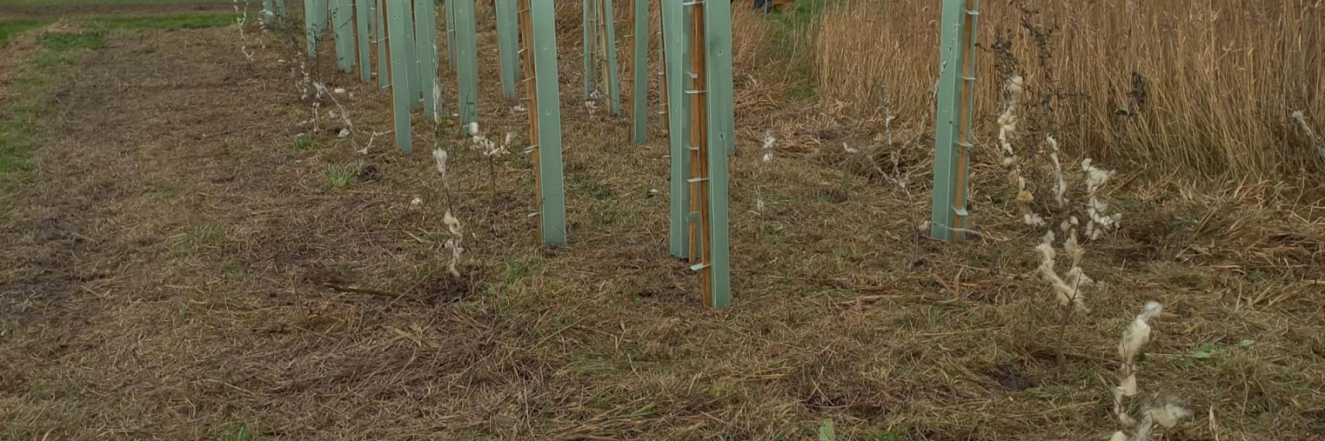 Om jonge struiken te beschermen tegen vraat door reeën, worden vaak plastic boombeschermers gebruikt. Helaas komen hiervan regelmatig stukjes in de omgeving terecht. Daarom experimenteren we met een natuurlijk alternatief: schapenwol gewikkeld rondom jonge struiken. De sterke geur van de wol schrikt reeën af, waardoor de jonge boompjes de kans krijgen om ongestoord te groeien.